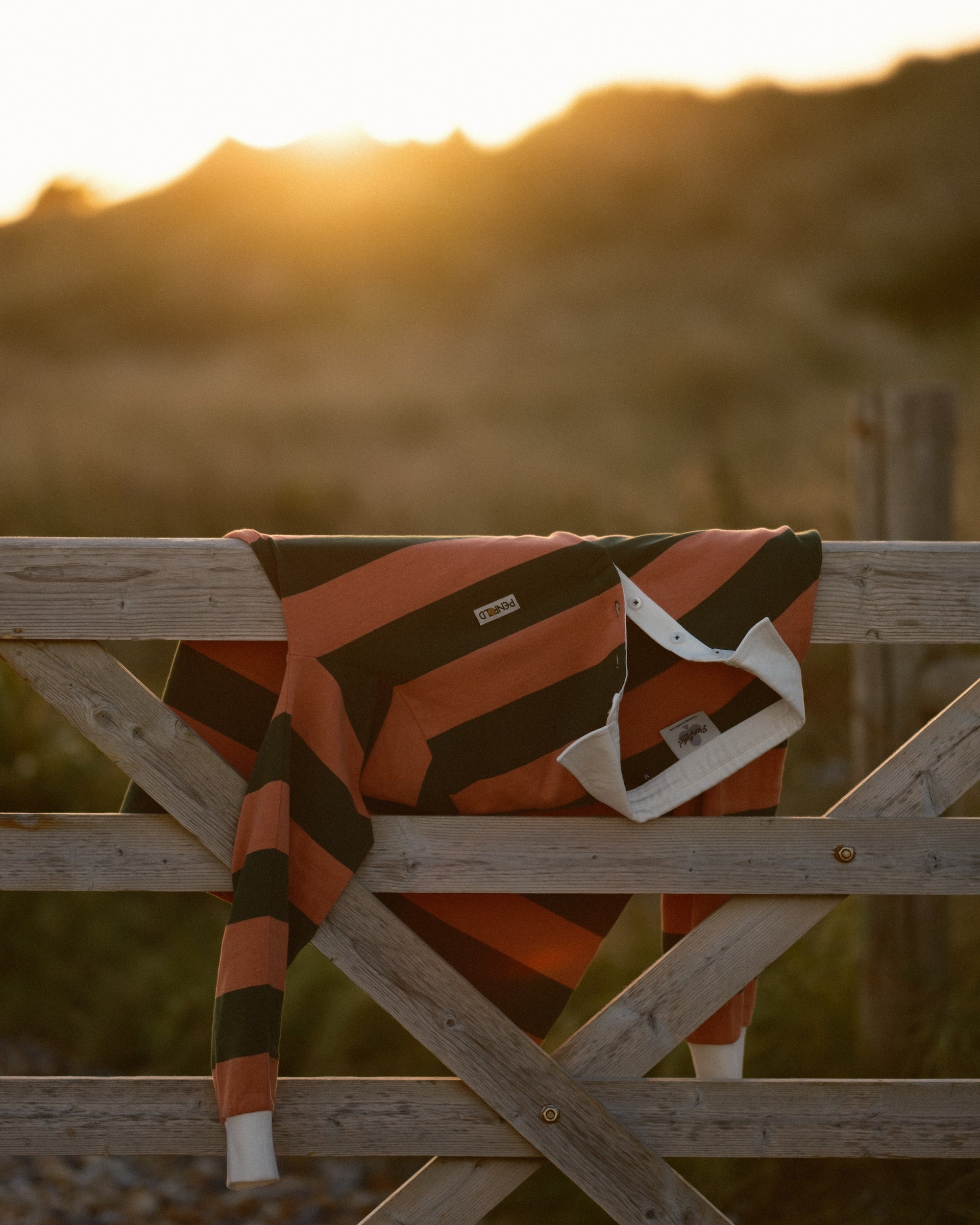 A classic staple in British attire - the British Stripe Rugby is made with 100% Cotton in an Olive and Coral striped pattern, and contrast thick collar. Wear it on or off the course for casual-meets-cool vibe
